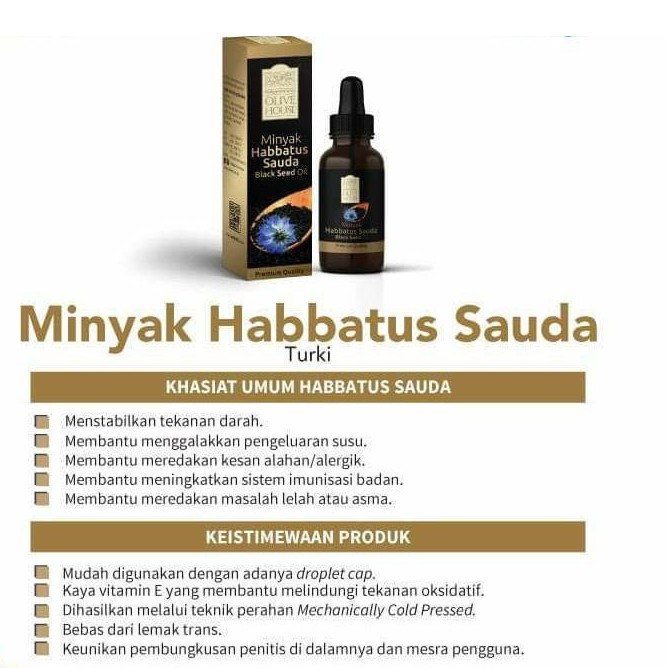 Ia adalah sejenis bijian yang amat penting di dalam bidang perubatan sehinggakan ianya disebut dalam sebuah hadith nabi yang diriwayatkan oleh Imam. Buat masa iniMinyak Habbatus Sauda Emas perahan sejuk hanya boleh diperolehi melalui jenama MINSYAM sahaja. Black Seed Oil or scientifically known as Nigella Sativa has been extensively studied for its useful health benefits.